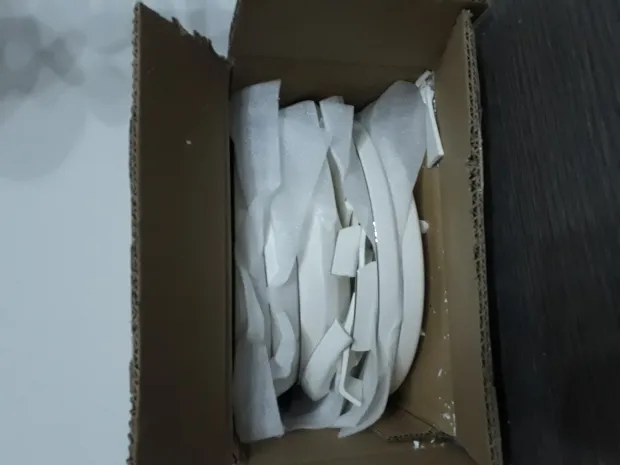 Yemek takımı çok şık ve kaliteli ama fotoğraftaki şekilde kırılmış 2 kenarları dökülmüş olarakta 3 tabak çıktı. Kaselerde ve servis tabaklarında hiç sorun yokken yemek ve tatlı tabaklarımda kırık parçalar var.